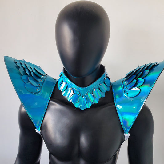 Burning Man Holographic Laser Blue Dragon Scale Armor, Rave Shoulder Piece Armor EDM Festival Outfit