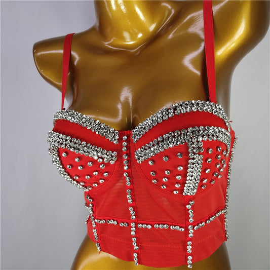 Red Burning Man Rave Festival Rhinestones Embellished Bustier Corset Top Bra Party Clothing 36063