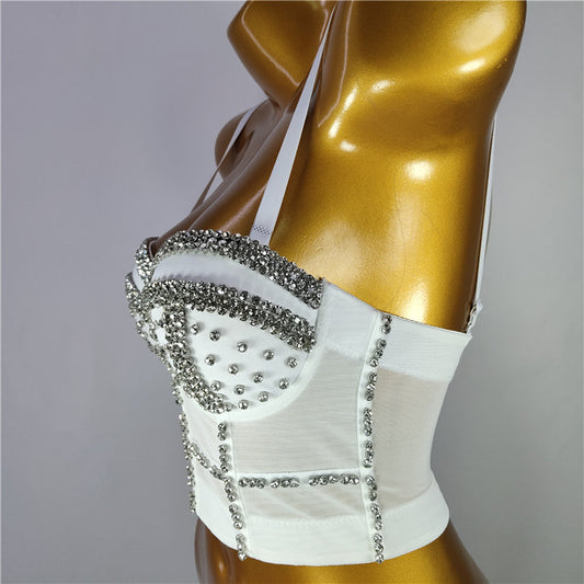White Burning Man Rave Festival Rhinestones Embellished Bustier Corset Top Bra Party Clothing 36062