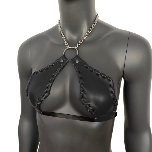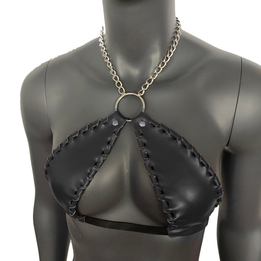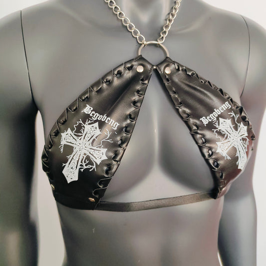 Gothic Black Vinyl Vampira Cross Top Bra with Chain