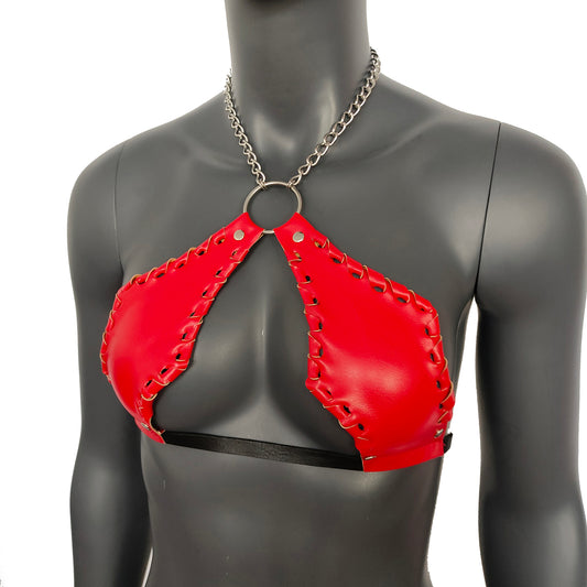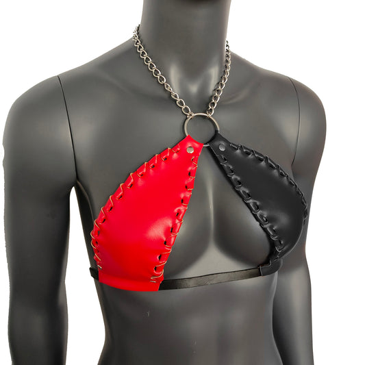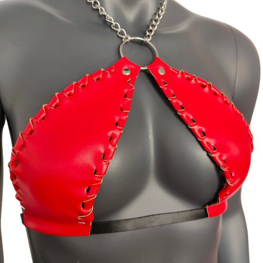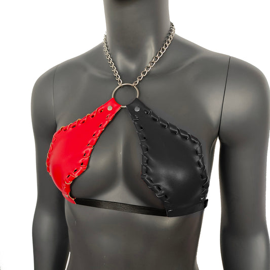 Gothic Red & Black Vinyl Vampira Cross Top Bra with Chain