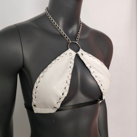 Gothic White Vinyl Vampira Cross Top Bra with Chain