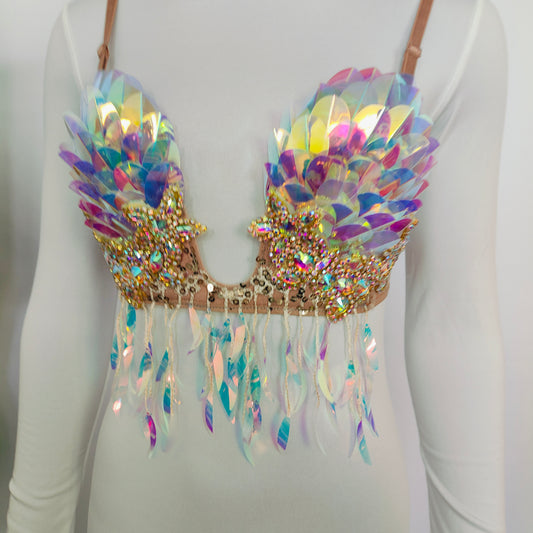 Holographic Mermaid Queen Bra,Iridescent Sequins Rave Bra,Rave Bra Outfit Dance Ocean Mermaid Festival Cosplay Burlesque