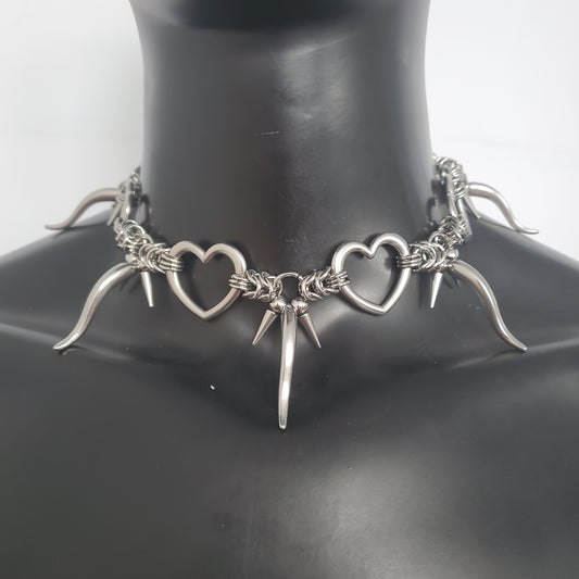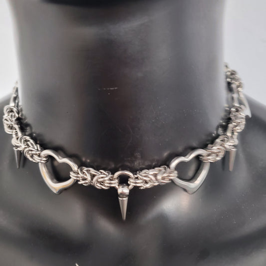 Collier de chaîne en acier inoxydable punk, collier pendentif à pointes en acier inoxydable argenté pour hommes et femmes, collier unisexe, collier en anneau de cœur - fait à la main