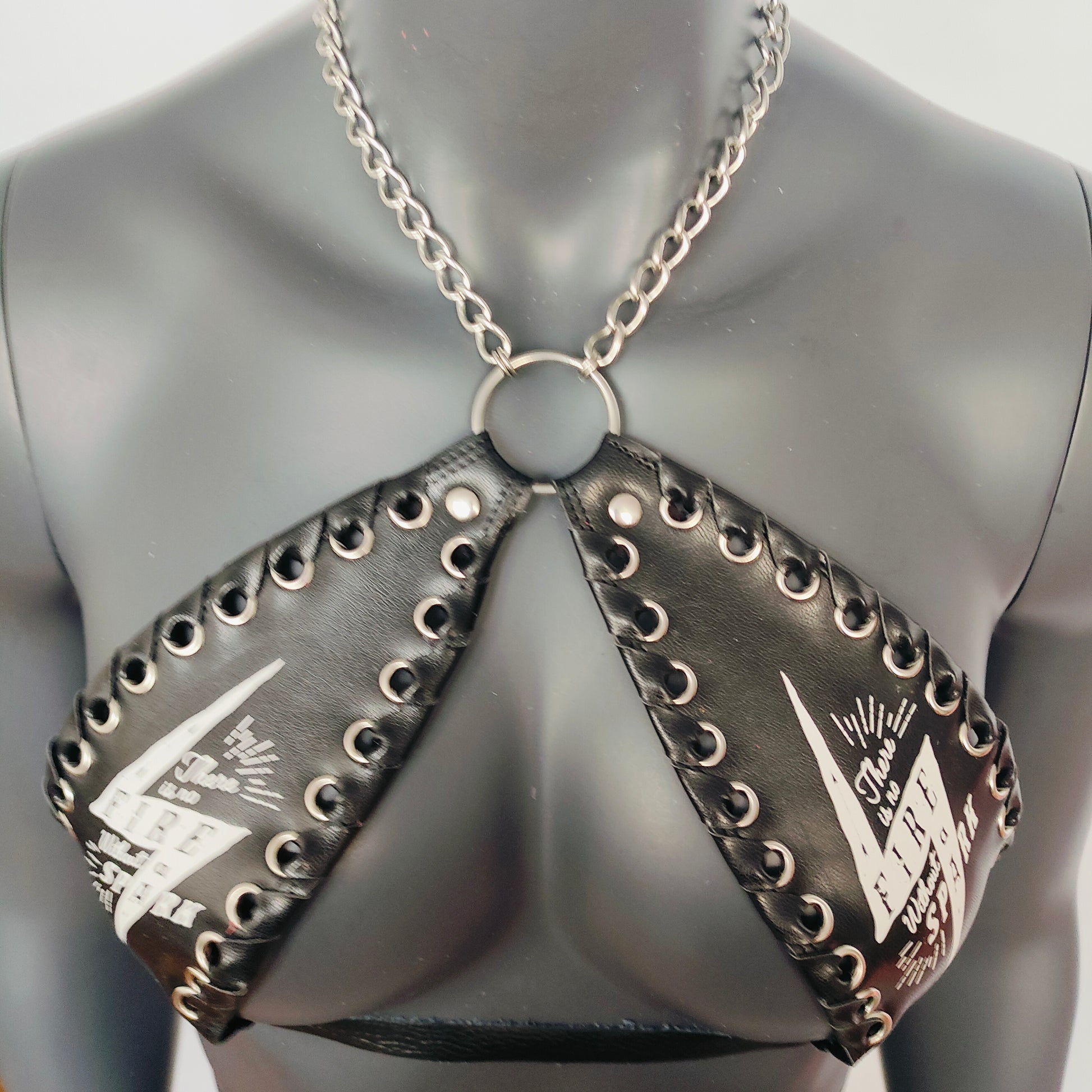 Gothic White Lightning Print Black Vinyl Vampira Cross Top Bra