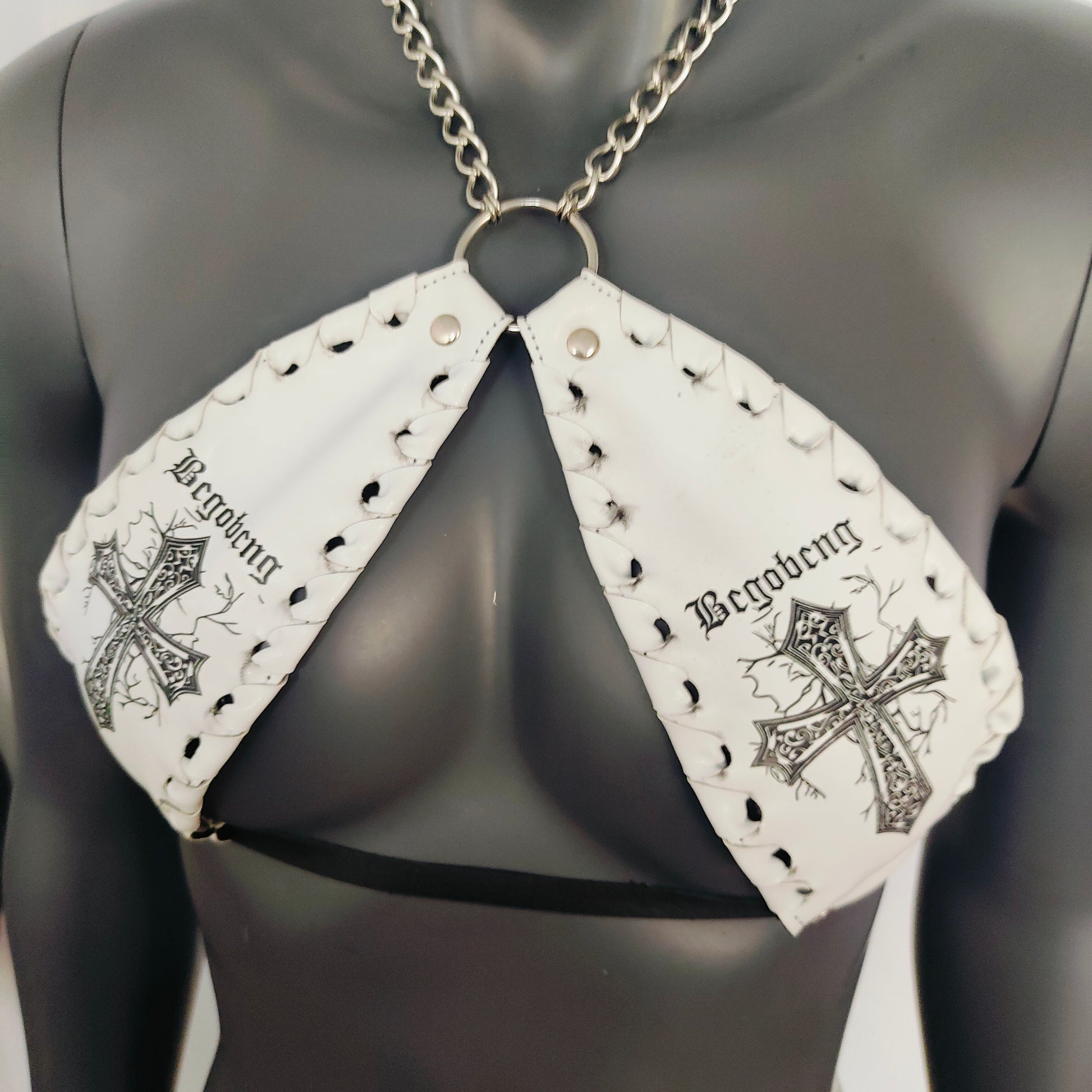 Gothic White Vinyl Vampira Cross Sexy Top Bra with Chain